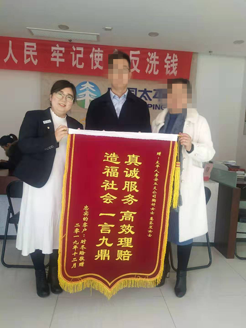 时先生收到太平人寿赔付9万余元的理赔结案短信后,通过电话向安丘支公司致谢。12月7日,时先生将印有“真诚服务高效理赔、造福社会一言九鼎”的锦旗送到公司,表达了无限感激。这面锦旗在这个寒冬温暖了每个人的心,保险也许不能使我们的生活发生改变,但是能保证我们的生活在风险发生时不改变。(太平人寿潍坊中支 鞠妍)